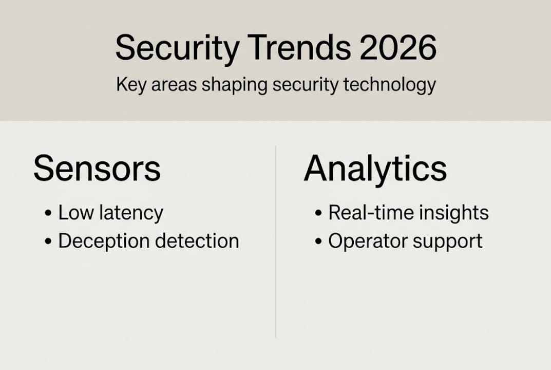 Discover the top security technology trends for 2026, including autonomous sensor management and AI analytics with AUC 0.96 and 23ms latency for industrial and government sectors.