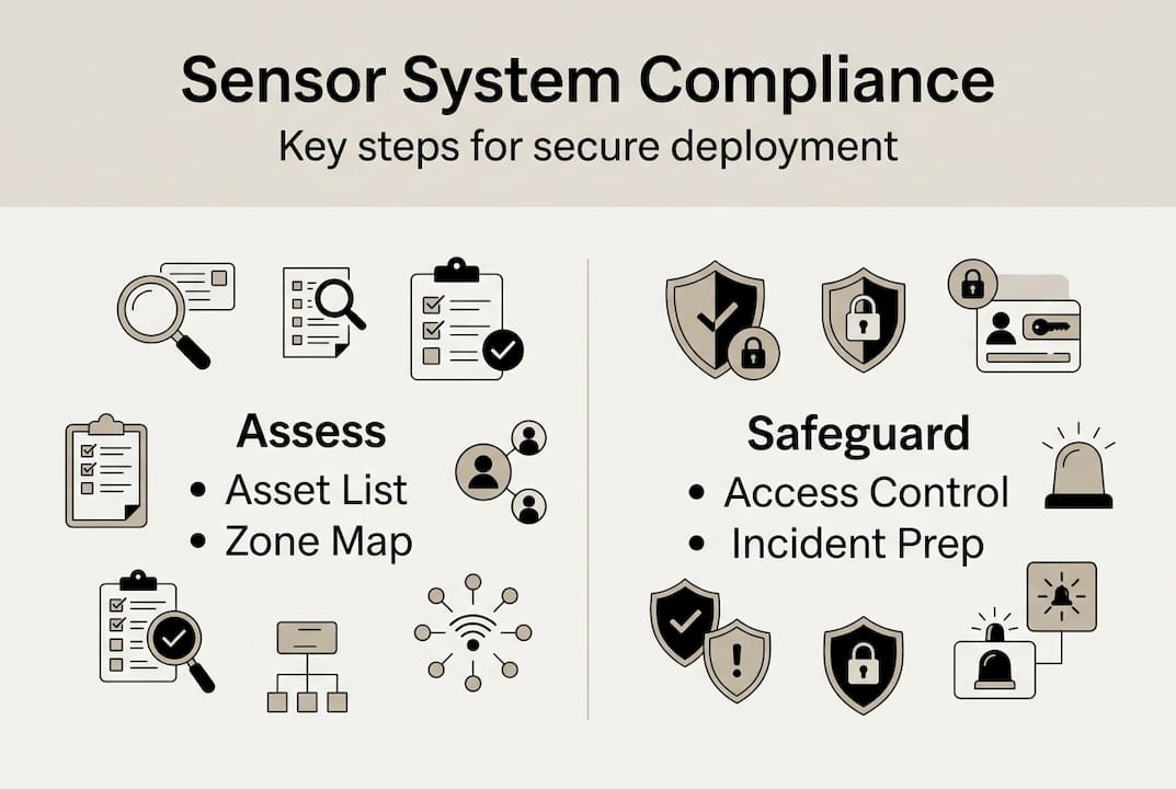 Asset inventory, risk-based zone segmentation, layered OT-appropriate defenses, continuous monitoring, and documented validation processes are the essential steps for sensor-based compliance programs.
